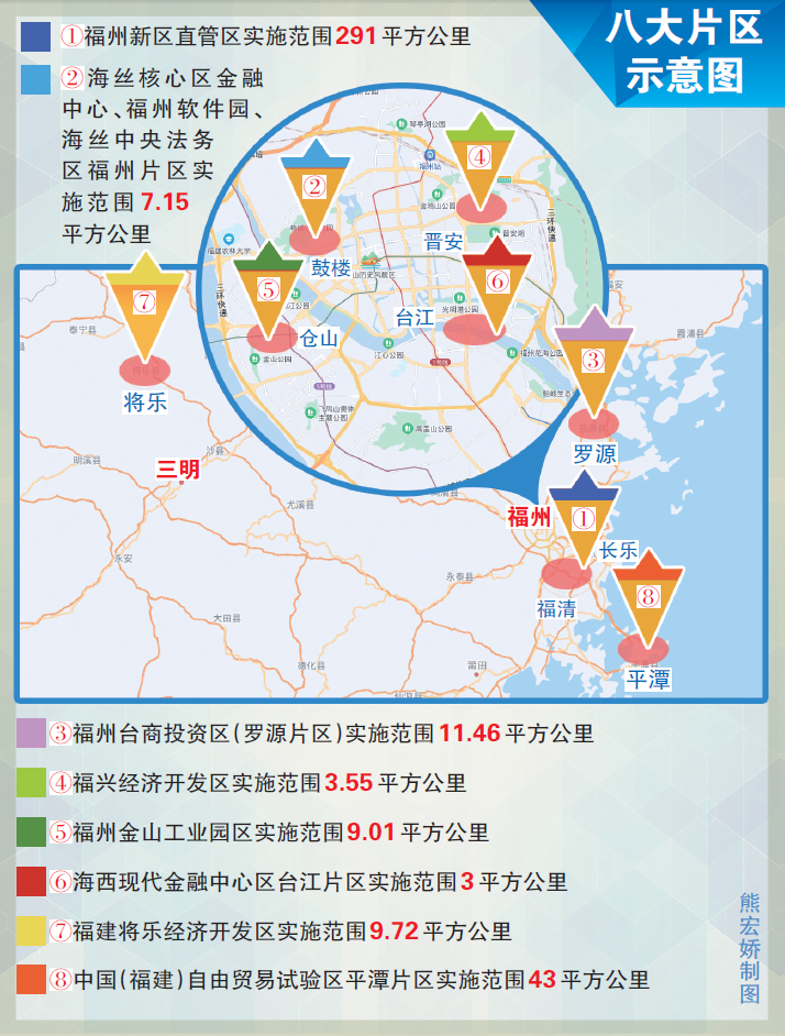 ——海丝核心区金融中心实施范围5.15平方公里,包括CBD商务金融中心、朱紫坊基金港等区域;福州软件园实施范围2平方公里,包括福州软件园A-G区、数字化转型促进中心、新能源科创中心等区域;海丝中央法务区福州片区包括线下实体法务服务中心、法务人才服务驿站、名师工作室、“榕城融法7+1”共享空间等平台。