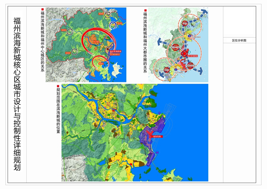 福州滨海新城位于福州沿江、向海两条轴线交叉的核心区域,西承主城,南接平潭、福清,北联罗源湾,多条重要的交通动脉在此交汇,面积188平方公里。其中,核心区面积86平方公里,北至机场高速、西至泽竹快速路、南至下沙。规划区处于滨海新城心脏地带,北接机场高速通往福州主城区及长乐国际机场;南侧228国道、201省道等通往下沙及松下港区,交通便利。