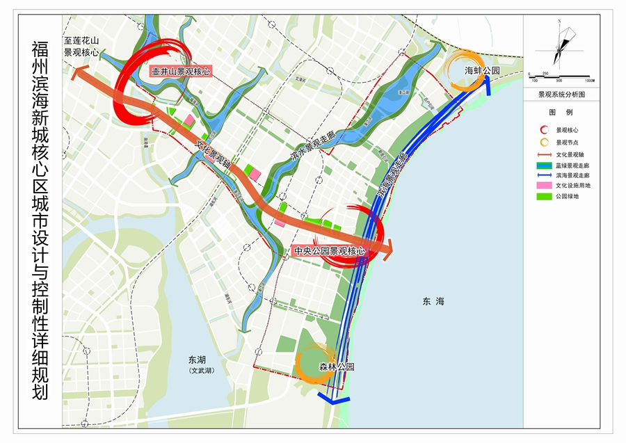 行政文化轴——沿福海路形成城市行政文化轴,从西往东始于莲花山脚的行政中心,终于滨海的城市中央公园,串联壶井公园、青少年活动中心、文化馆、美术馆、市民服务中心、中央商务区标志性塔楼、中央公园、滨海博物馆等设施,结合绿地、轨道站点设置,形成东西向贯穿规划区的城市级行政文化轴线。