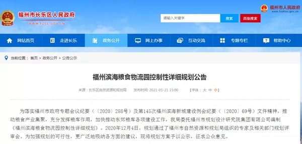 日前,长乐区人民政府网站对《福州滨海粮食物流园控制性详细规划》进行公示。