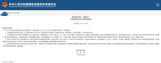 2日,国家发展改革委网站发布《国家发展改革委 民航局关于支持福州临空经济示范区建设的复函》。内容如下: