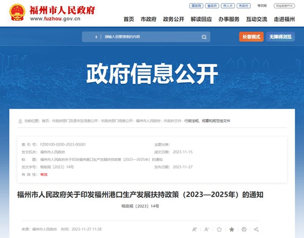 福州市人民政府关于印发福州港口生产发展扶持政策(2023—2025年)的通知