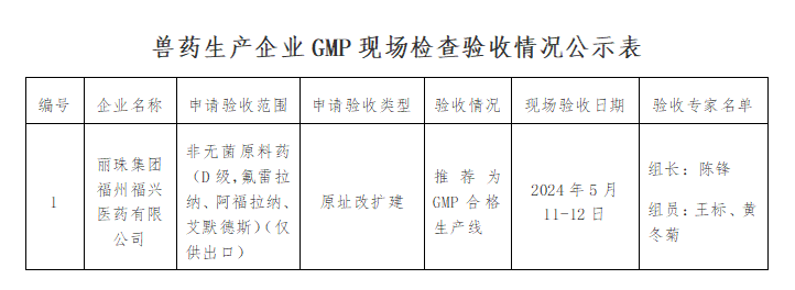 根据《兽药生产质量管理规范》的规定,依照农业部第2262号公告公布的《兽药生产质量管理规范检查验收办法》,根据市政府《福州市人民政府办公厅转发成人影院 管委会关于承接121项省级经济管理权限实施方案的通知》(榕政办〔2016〕246号),按流程由福州市农业农村局派出专家组对以下1家企业实施GMP的情况进行现场检查验收。现将检查情况在成人影院 官网上予以公示,公示时间为2024年7月9日至2024年7月15日,请将意见和建议反馈给成人影院 管委会。