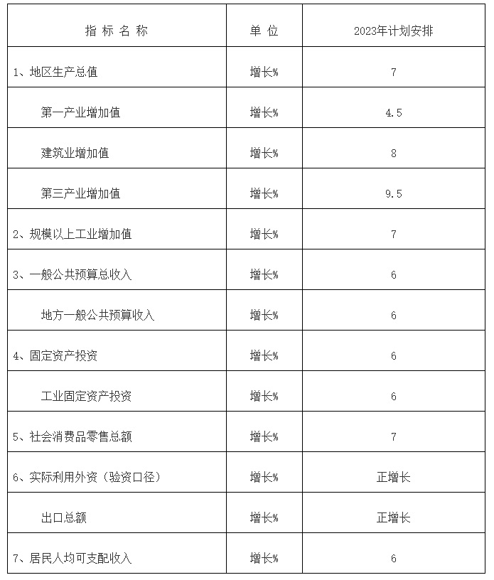按照以上总体要求,2023年经济发展预期目标是:地区生产总值增长7%,第一产业增加值增长4.5%,建筑业增加值增长8%,