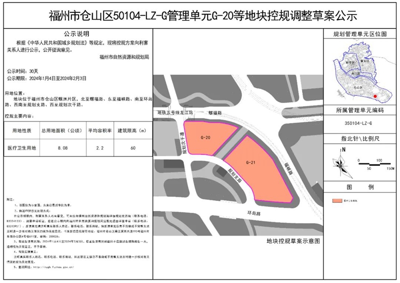 福州市仓山区350104-LZ-G管理单元G-20等地块位于仓山区螺洲片区,北至螺福路、东至福峡路、南至环岛路、西南至规划支路、西至规划次干路,面积约8.08公顷(约121.2亩)。该控规草案经研究审议,根据《中华人民共和国城乡规划法》等相关规定,公示时间为2024年1月4日至2024年2月3日。