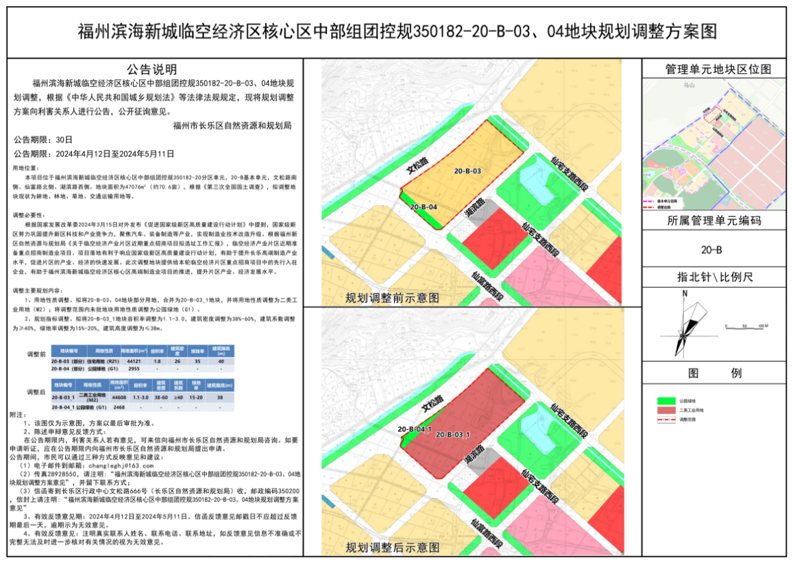 3、信函寄到长乐区行政中心文松路666号(长乐区自然资源和规划局)收,邮政编码350200,信封上请注明“福州滨海新城临空经济区核心区中部组团控规350182-20-B-03、04地块规划调整方案意见”。