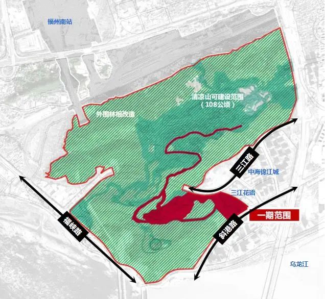 福州三江口植物园项目一期位于仓山区三江口片区清凉山。建设用地面积约207183平方米,用地性质为公园绿地(G1)。
