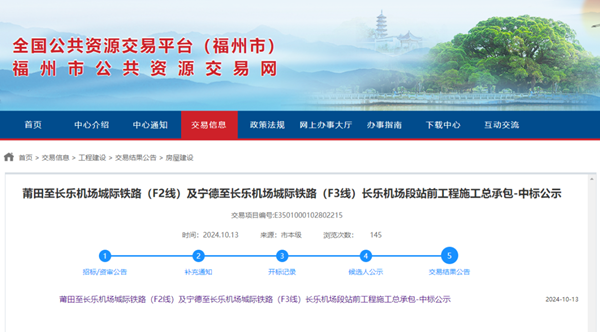 10月13日,福州市公共资源交易网发布“莆田至长乐机场城际铁路(F2线)及宁德至长乐机场城际铁路(F3线)长乐机场段站前工程施工总承包中标结果公示”。