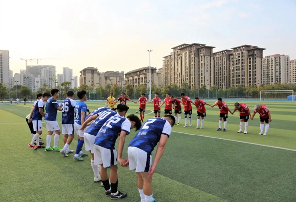 球赛开场前,福建省香港商会足球队和福州市长乐区金刚腿足球队的队员们相互握手,表示友好。