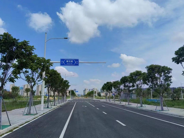 项目采用定制弧线预制路缘石、多功能综合杆,沿线绿化采用多种绿化植物组合搭配,错落有序,有效提升道路景观。