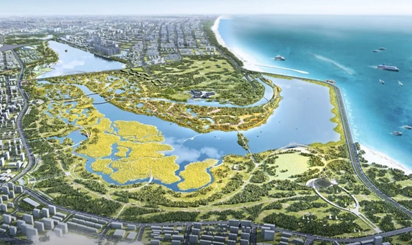 “一带”即东侧沿海以城市带状景观绿地公园模式,建设超300米宽的沿海防护森林景观带;